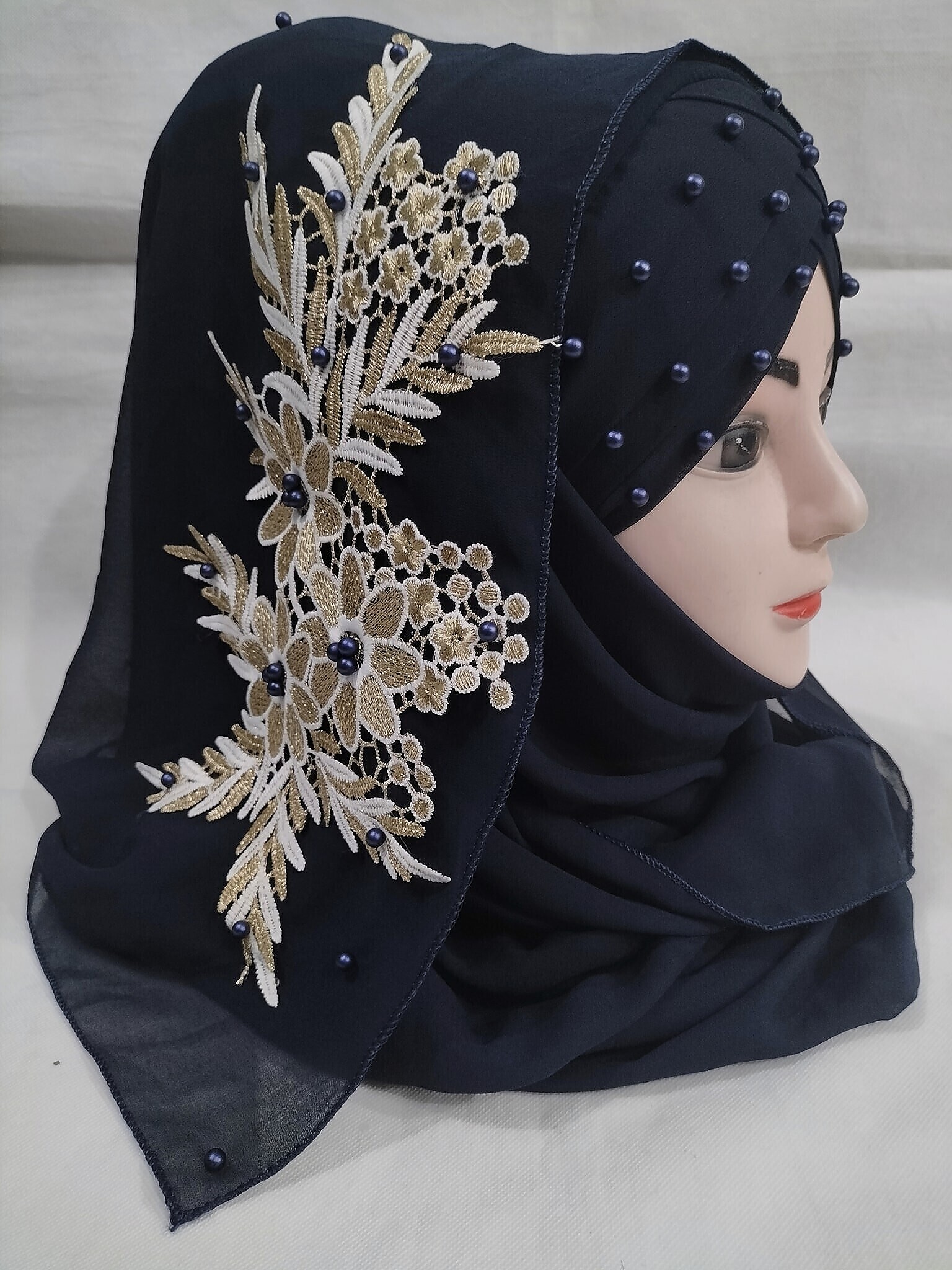 Pearl Floral Ready to Wear with 3D Bunch – Dark Navy Blue