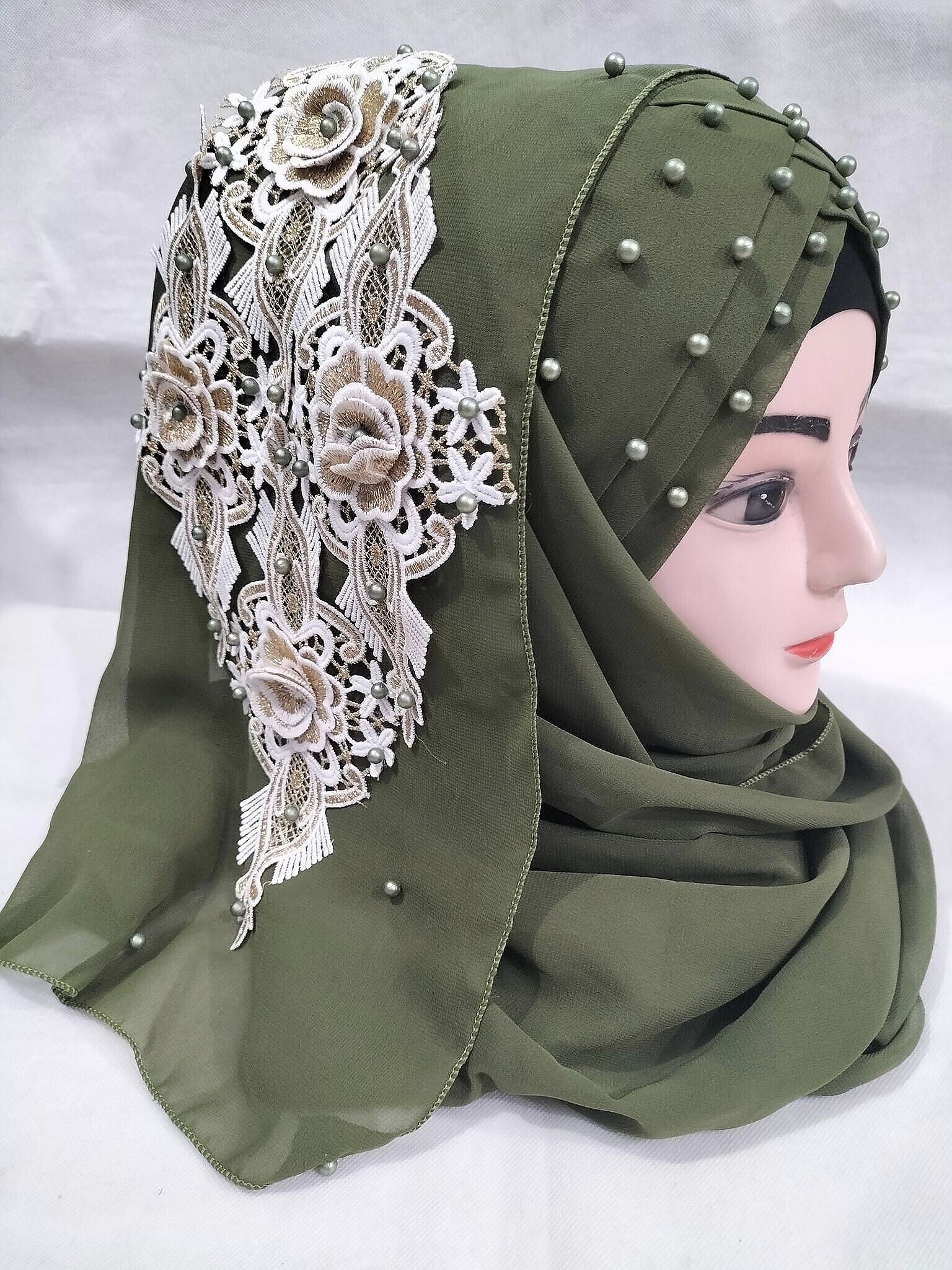 Pearl Floral Ready to Wear with 3D Fancy Bunch – Dark Olive Green (Mehndi)
