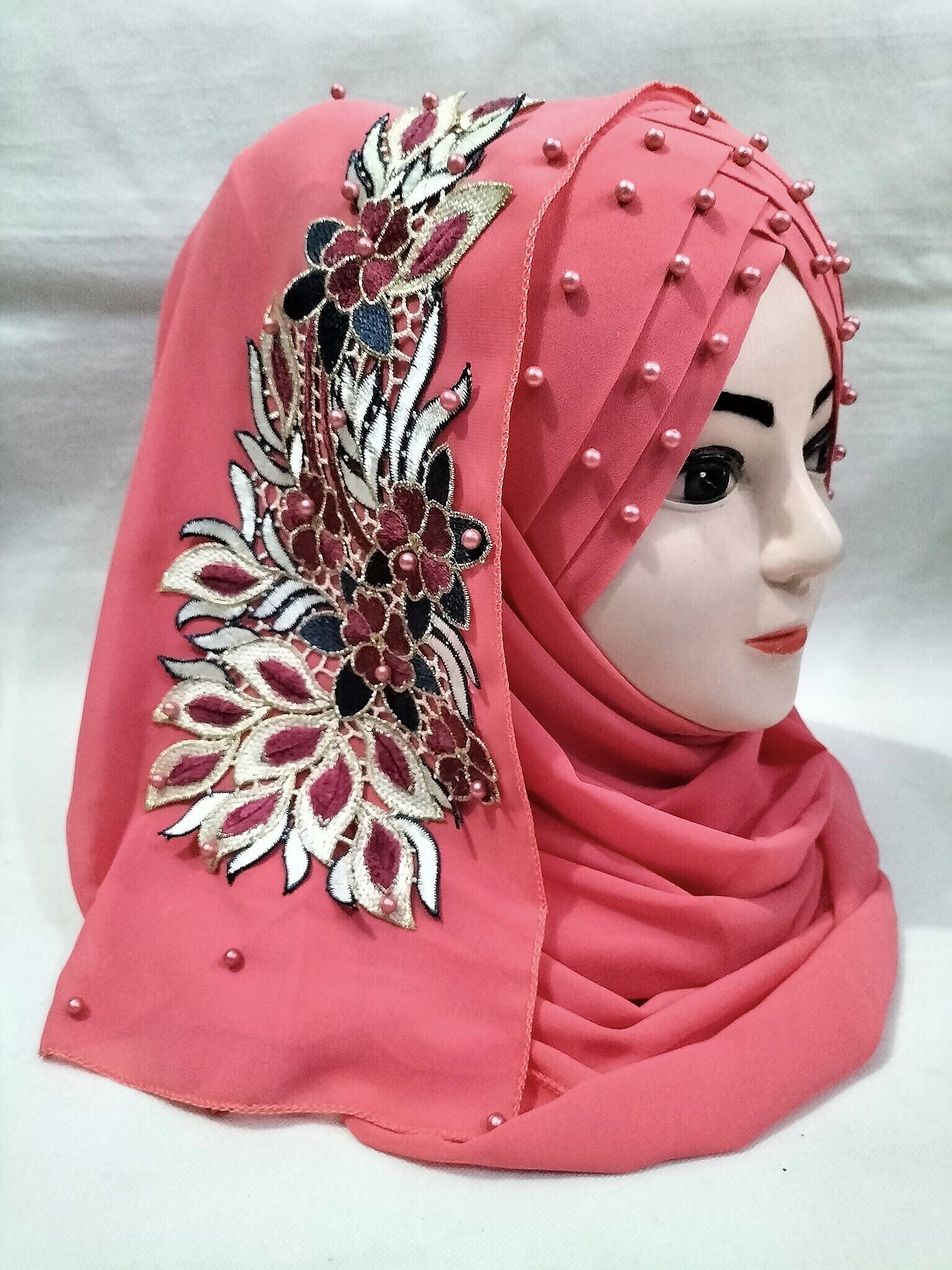Pearl Floral Ready to Wear with 3D Fancy Flower Bunch – Coral Pink (Design 2)