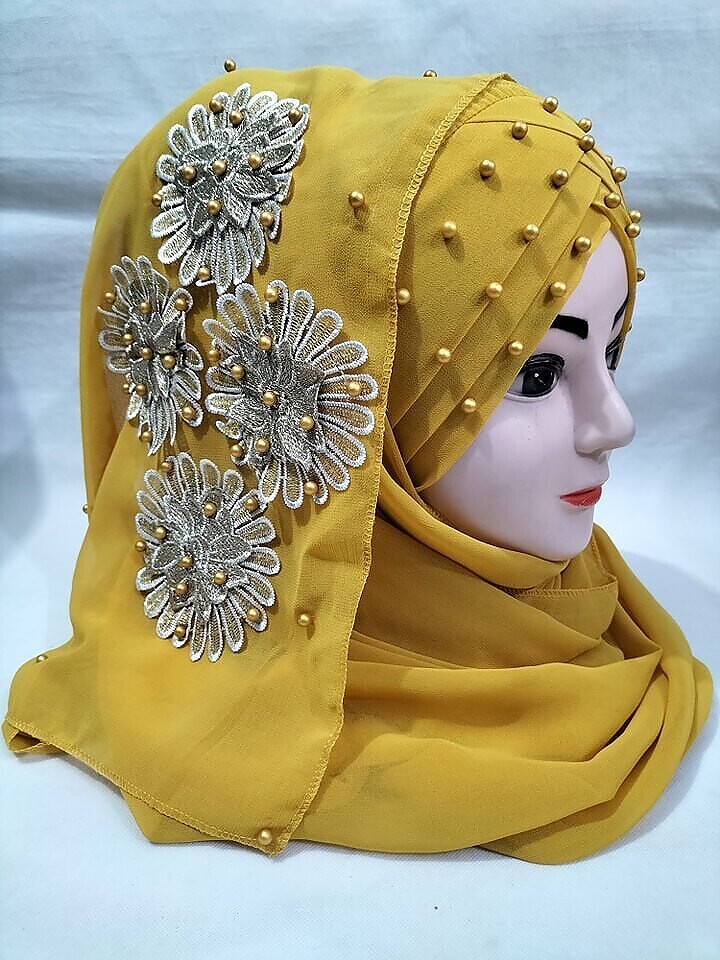 Pearl Floral Ready to Wear with 3D Fancy Flower Bunch – Mustard