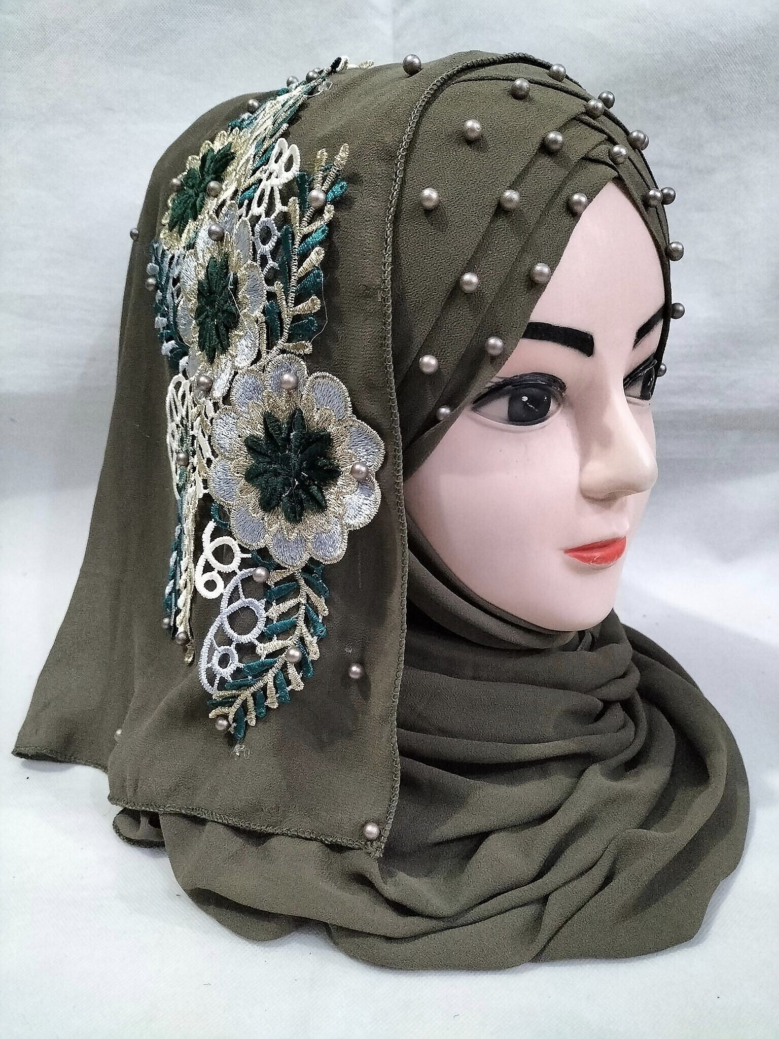 Pearl Floral Ready to Wear with 3D Fancy Flower Bunch – Sage Green (Design 1)
