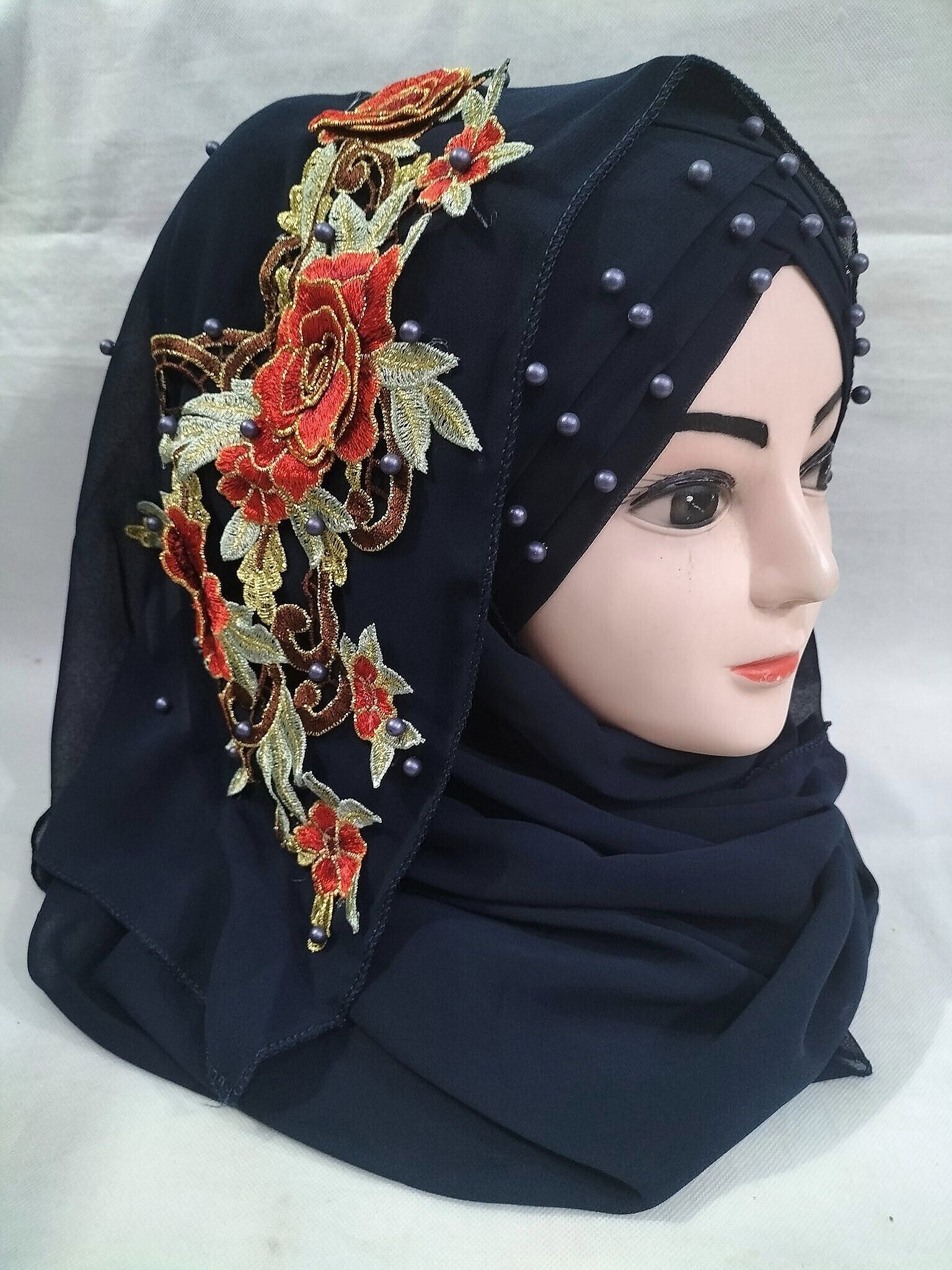 Pearl Floral Ready to Wear with 3D Flower Bunch – Navy Blue