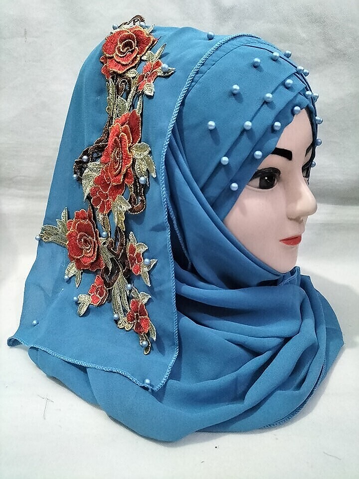 Pearl Floral Ready to Wear with 3D Flower Bunch – Blue