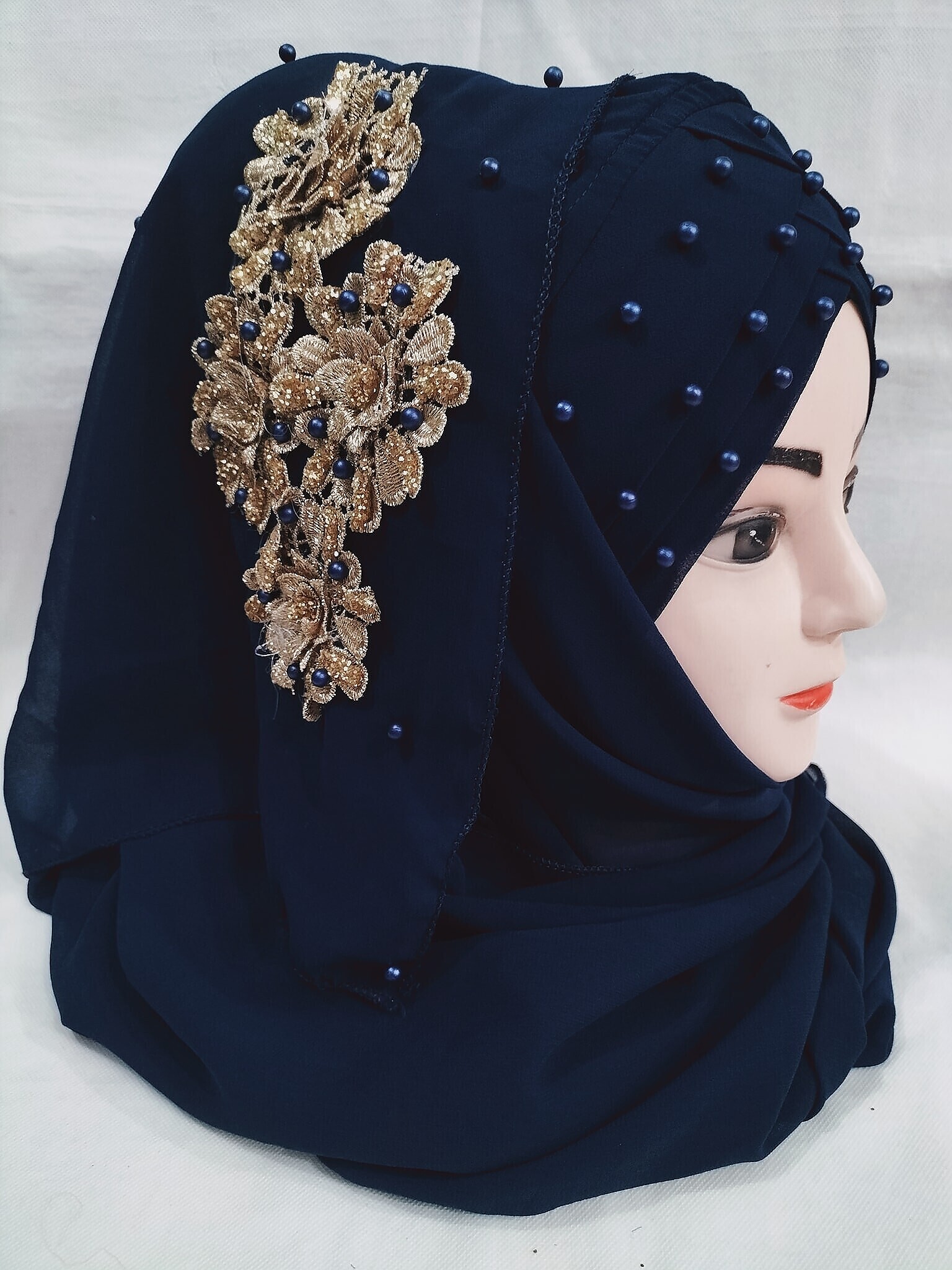 Pearl Ready to Wear with Golden Flower Bunch – Dark Navy Blue