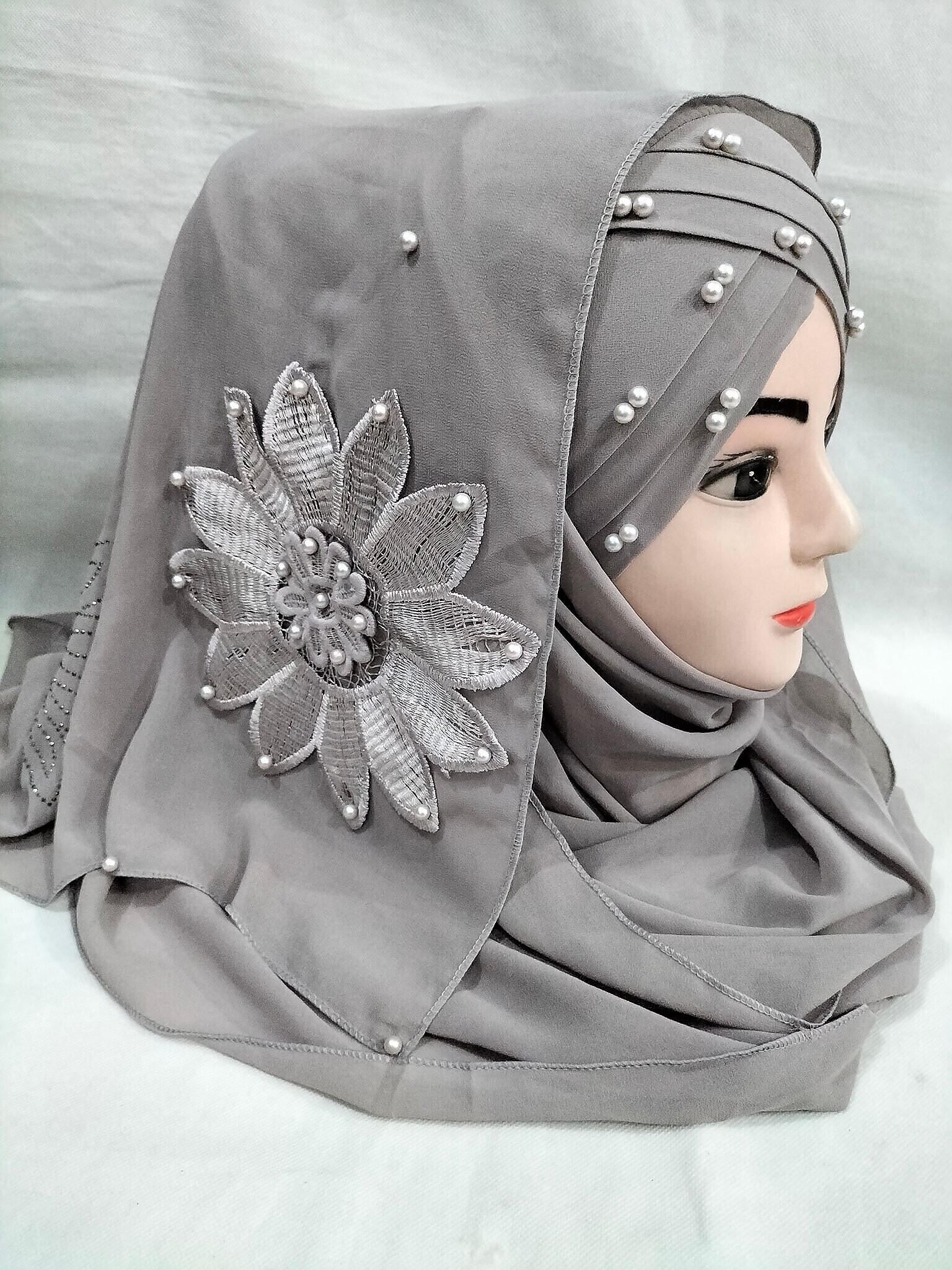 Pearl Ready to Wear with Matching Flower Bunch – Light Grey